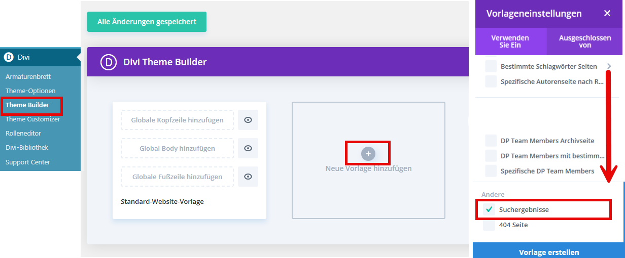 Geh in deinem WordPress-Dashboard auf Divi > Theme Builder. Klick oben auf „Neue Vorlage hinzufügen“ und wähle „Suchergebnisse“. Damit legst du eine Vorlage speziell für Suchergebnisse an.